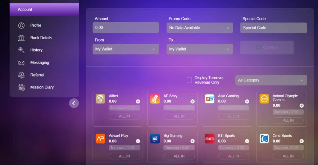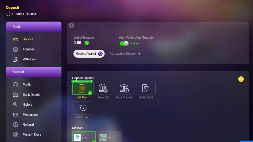 - ฝากเงินไปกระเป๋า : เลือกกระเป๋าหลัก หรือกระเป๋าพนันที่ท่านต้องการเล่น